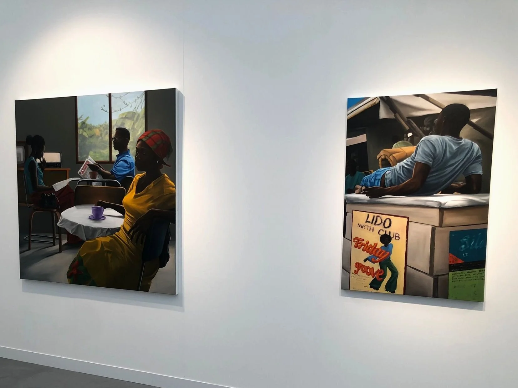 Credit & Courtesy of: Peter Uka, The Café, (2024) and Flyers Point (2024) at Marianne Ibrahim Gallery [Booth AA5]. Photo © & Courtesy of Chris Townsend.