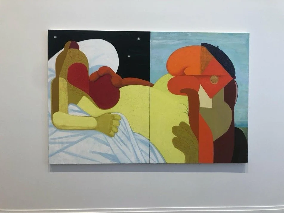 Nicole Eisenman’s Hauser & Wirth show is dominated by a monumental moving sculpture featuring two figures. One stands with an arm jerking up and down in a futile motion. Its other arm clings to a strap attached to a square-wheeled cart—another exercise in futility—on which the second figure crouches on all fours. This piece, originally part of Eisenman’s 2019 Whitney Biennial installation, was a resounding success and reintroduction to new audiences unaware of her centrality to the 90s art dialogue. The sculpture is surrounded by paintings, including a diptych entitled ‘The Artist at Work.’ This painting playfully hints at a more cheeky, perhaps even sexual, interpretation of the phrase and reflects a 90s sensibility and use of parody in art-making practices.