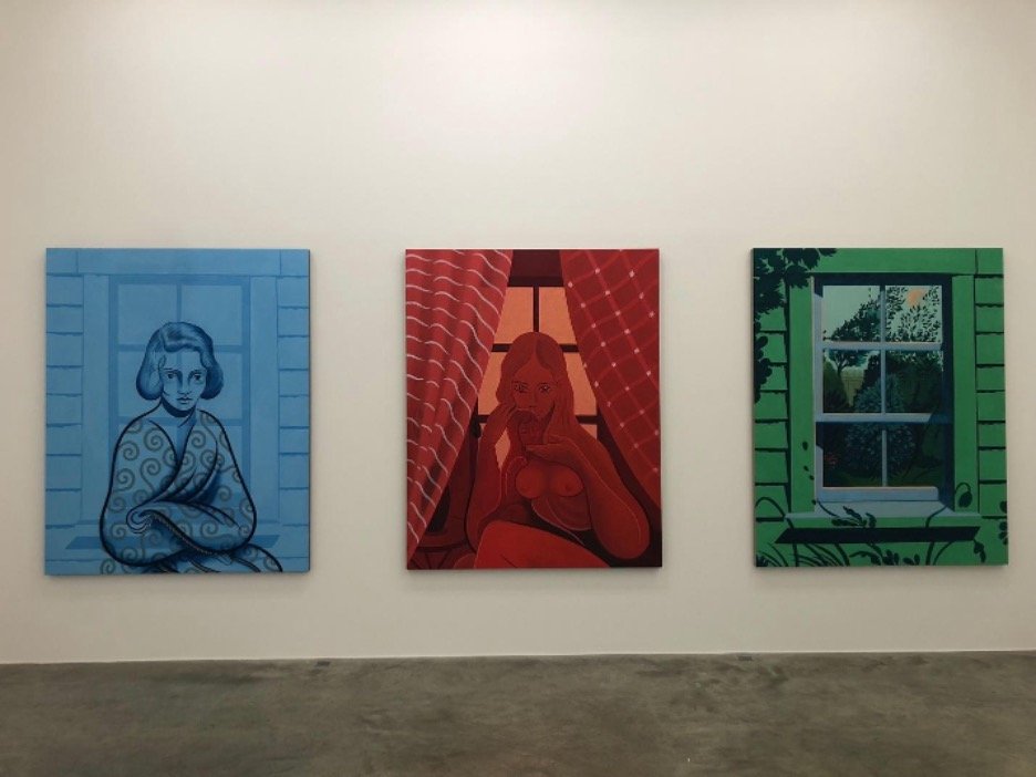 Credit & Courtesy of: Koak, Nancy in Blue (2024), Carmine (2023–2024), Self-portrait from a Green Window (after Lois Dodd), (2023–2024), exhibition view at Perrotin Paris